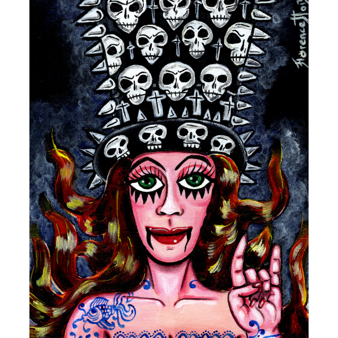 Portrait d'une pin-up de style gothique, aux cheveux roux qui flottent vers le haut comme des flammes. Elle a les yeux vert, un maquillage noir évoquant l'univers punk rock et d'ailleurs elle fait le signe des cornes avec la main.