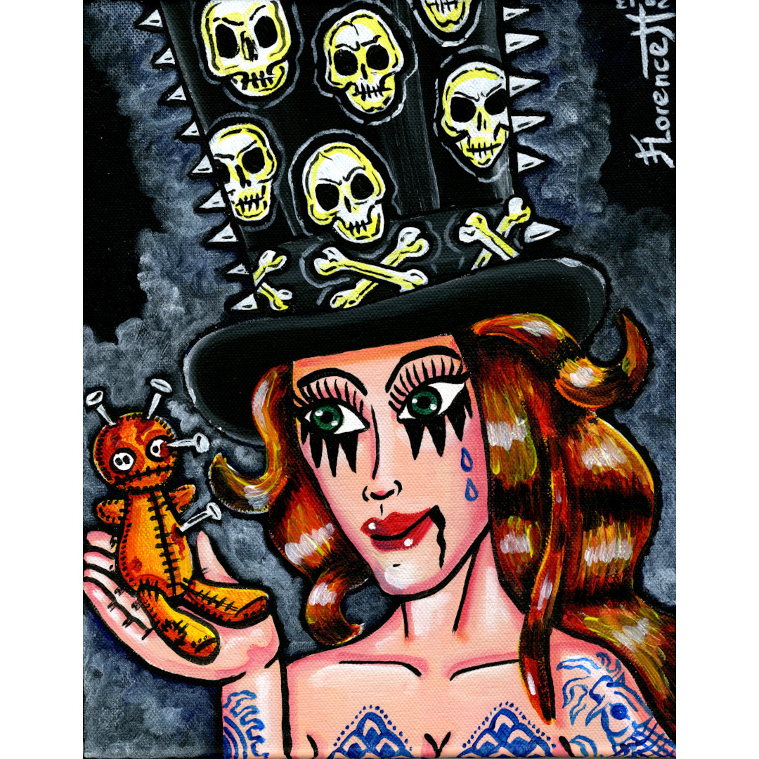 Portrait d'une jeune fille rousse aux yeux verts coiffée d'un Haut de forme sombre décoré de têtes de mort. Elle tient une poupée vaudoo dans la main. Ambiance gothique et punk rock.