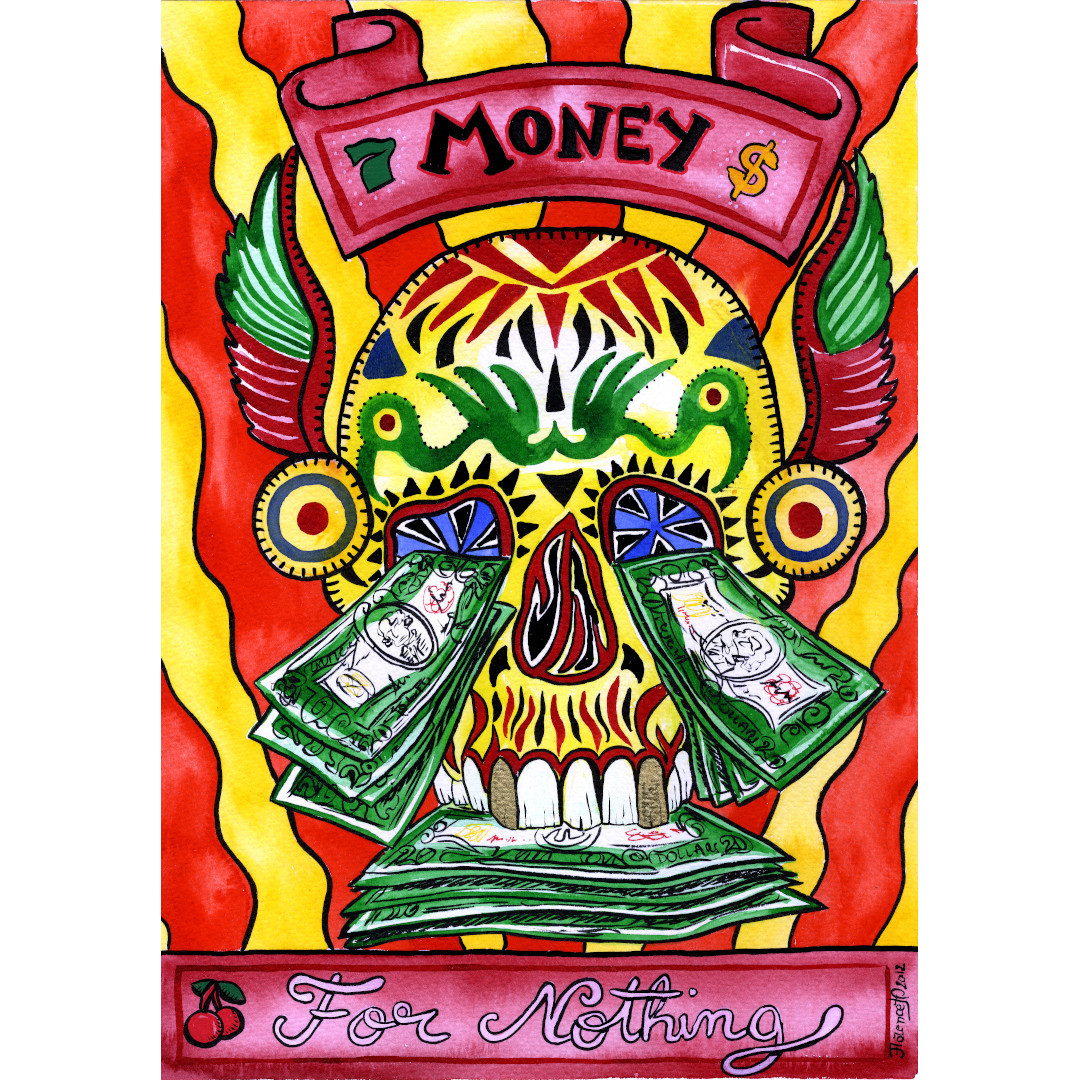 Cette aquarelle lumineuse se situe dans la tradition des créations liées au "Memento Mori" (Souvient toi que tu vas mourir) et des Vanités en mettant en valeur ici la futilité des jeux d'argent et de hasard (Money for Nothing = Argent pour rien )