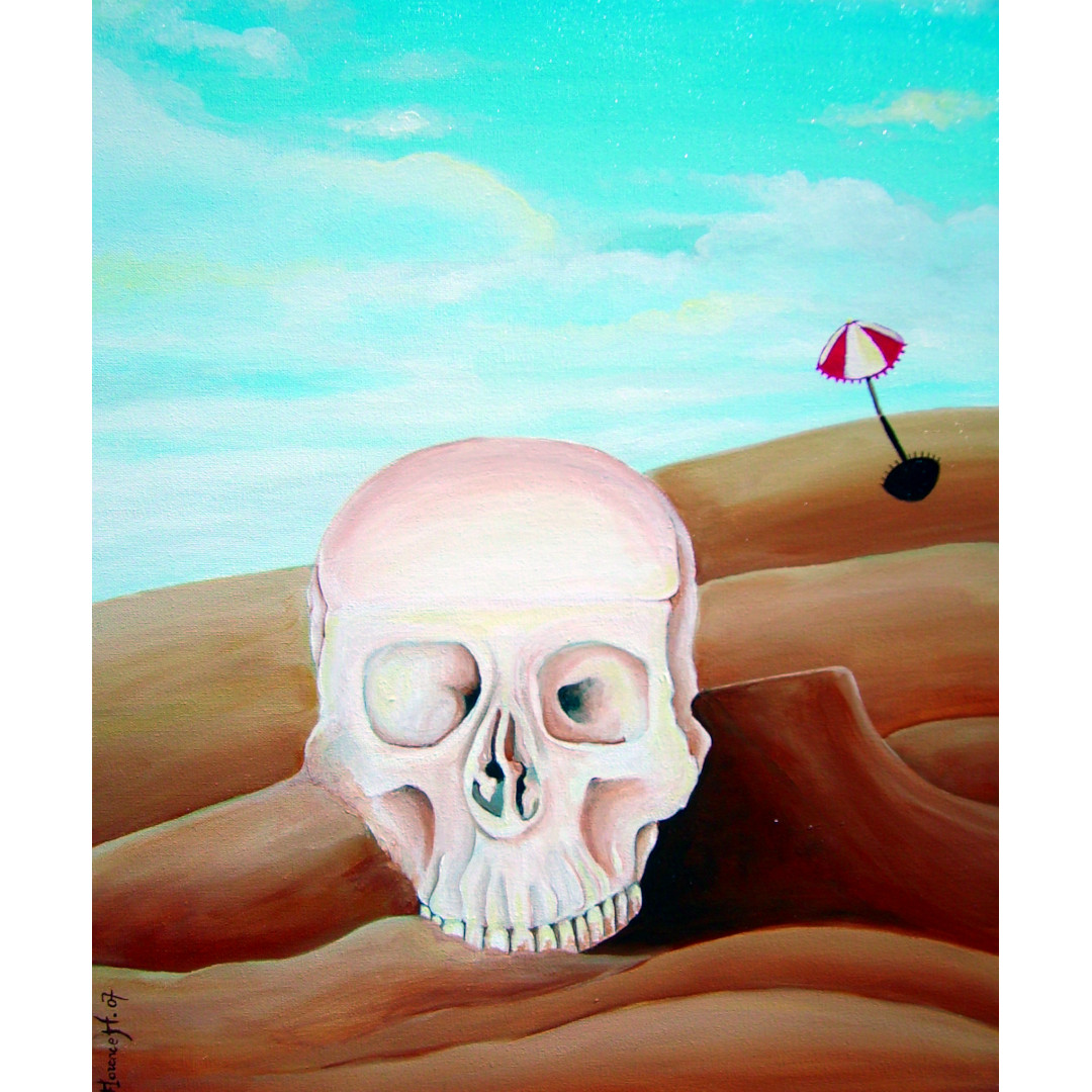 Au milieu d'un paysage classique composé d'un ciel bleu, légèrement nuageux et de ce que l'on devine être une plage ou un bout de désert, repose un crâne humain, parfaitement nettoyé, aux os d'un blanc laiteux. Les couleurs sont franches et réalistes, la lumière est celle de la mi-journée, où le soleil est au zénith. Détail bizarre : un parasol rouge, est planté dans le fond du décor. Tout parle de présence humaine, et pourtant il n'y a personne. Dramatique ou joyeuse scène ? Qui était là ? Qui ne l'est plus...