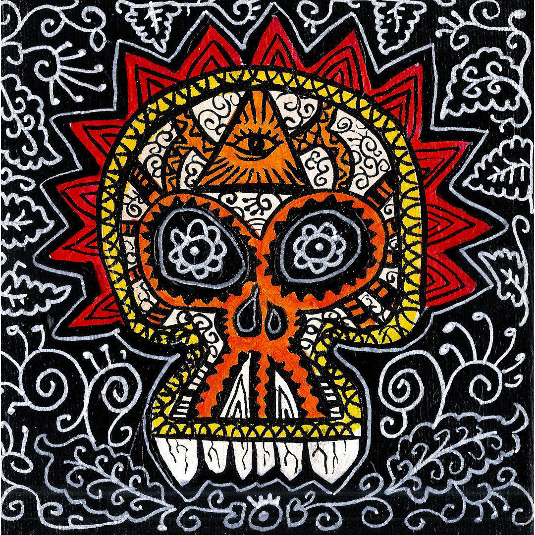 Joli petit tableau qui représente une tête de mort richement décorée de couleurs vives et rehaussées d'arabesques à la peinture blanche sur fond noir.
