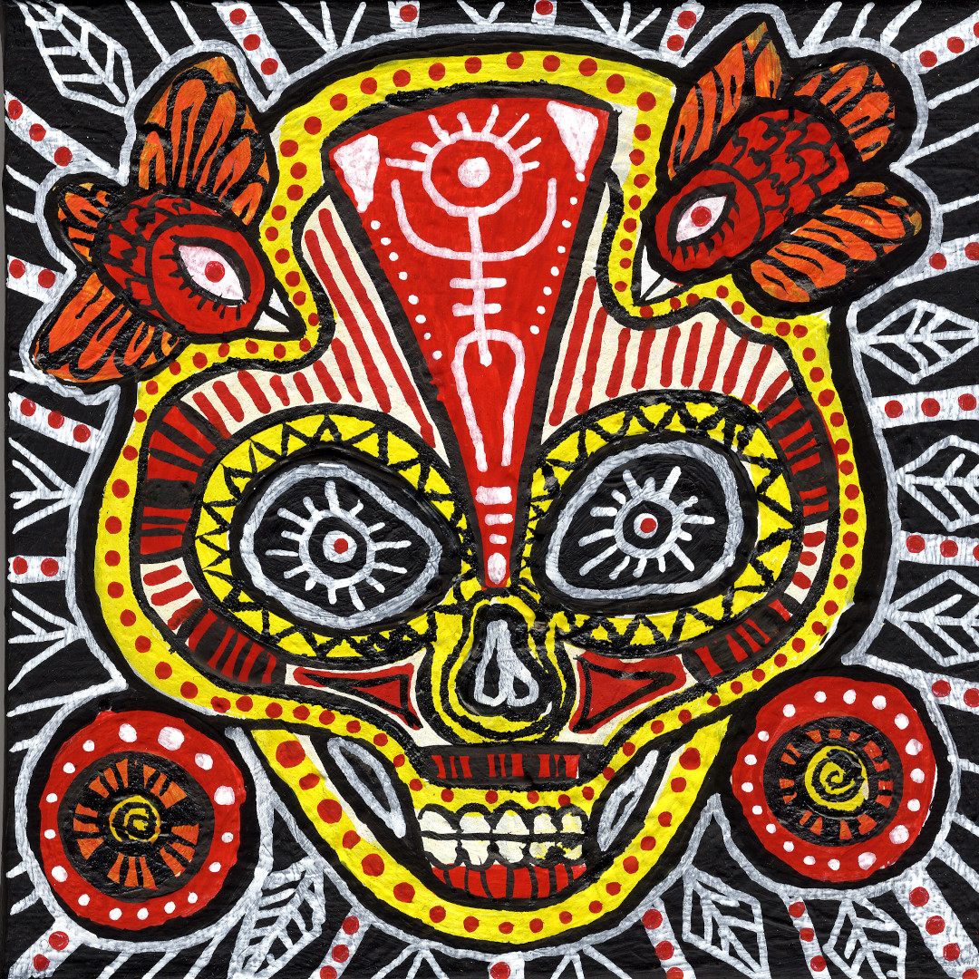 Jolie peinture sur fond noir, petit format, qui représente un crâne orné de couleurs vives et de motifs inspirés de différentes cultures. Au centre j'ai dessiné la silhouette d'une figure humaine en train d'évoquer les puissances de la Nature depuis la position du troisième oeil siège des pouvoirs occultes de l'individu.