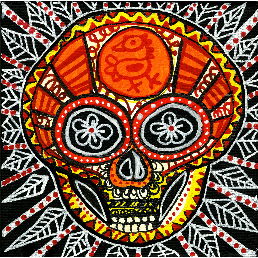 Très original petit tableau qui représente un crâne décoré aux couleurs vives sur fond noir dans un style vibrant évoquant celui du tatouage, du pop art et de la bd.