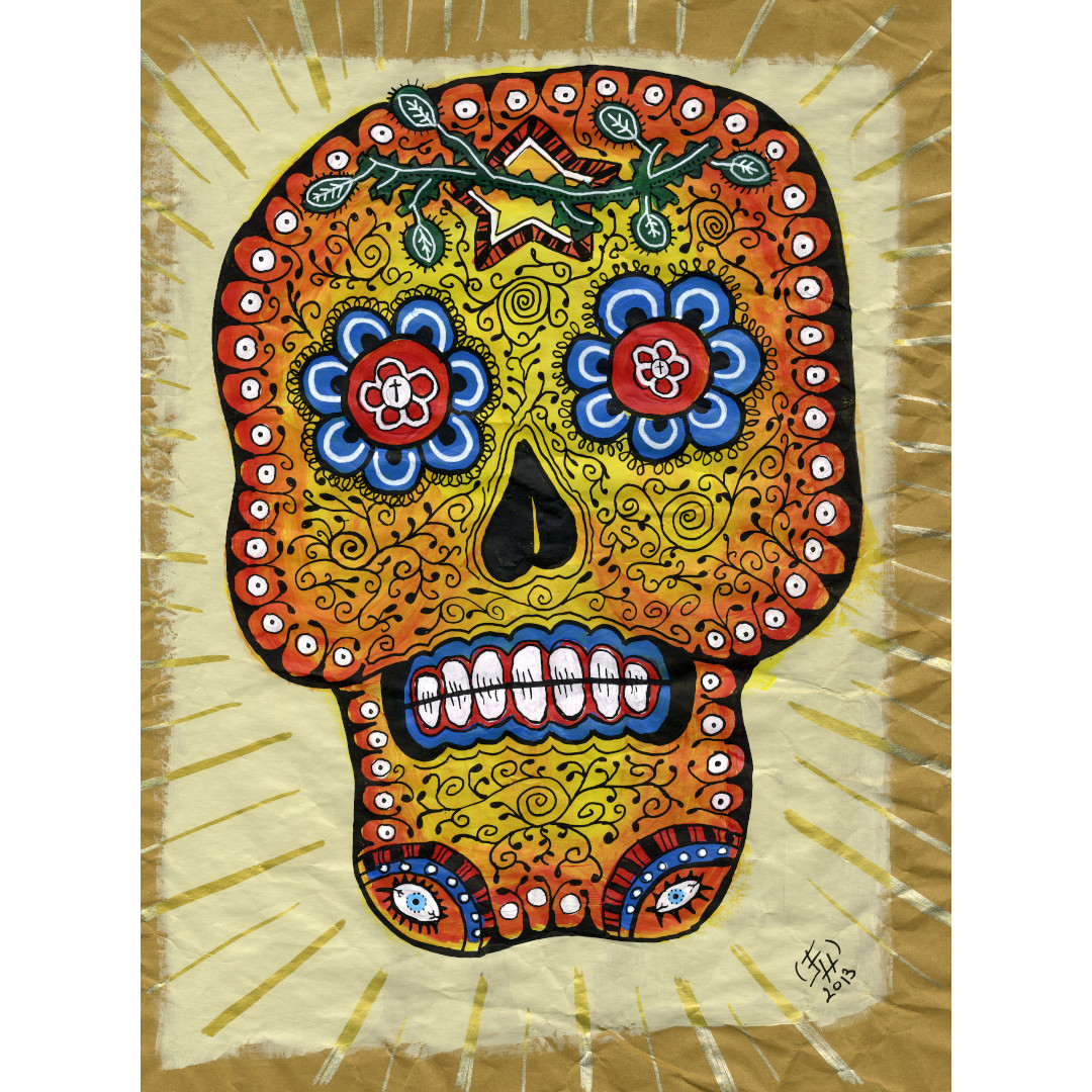 Tête de mort aux couleurs vives inspirée du folklore mexicain mais aussi de la tradition chrétienne allégorique du "mémento mori" ( souviens toi que tu vas mourir) qui rappelle la fragilité de l'existence humaine. Le choix du support : le papier craft d'emballage accentue le sentiment de vulnérabilité mais aussi une proximité avec la nature et les cycles de la vie, la mort et la renaissance.