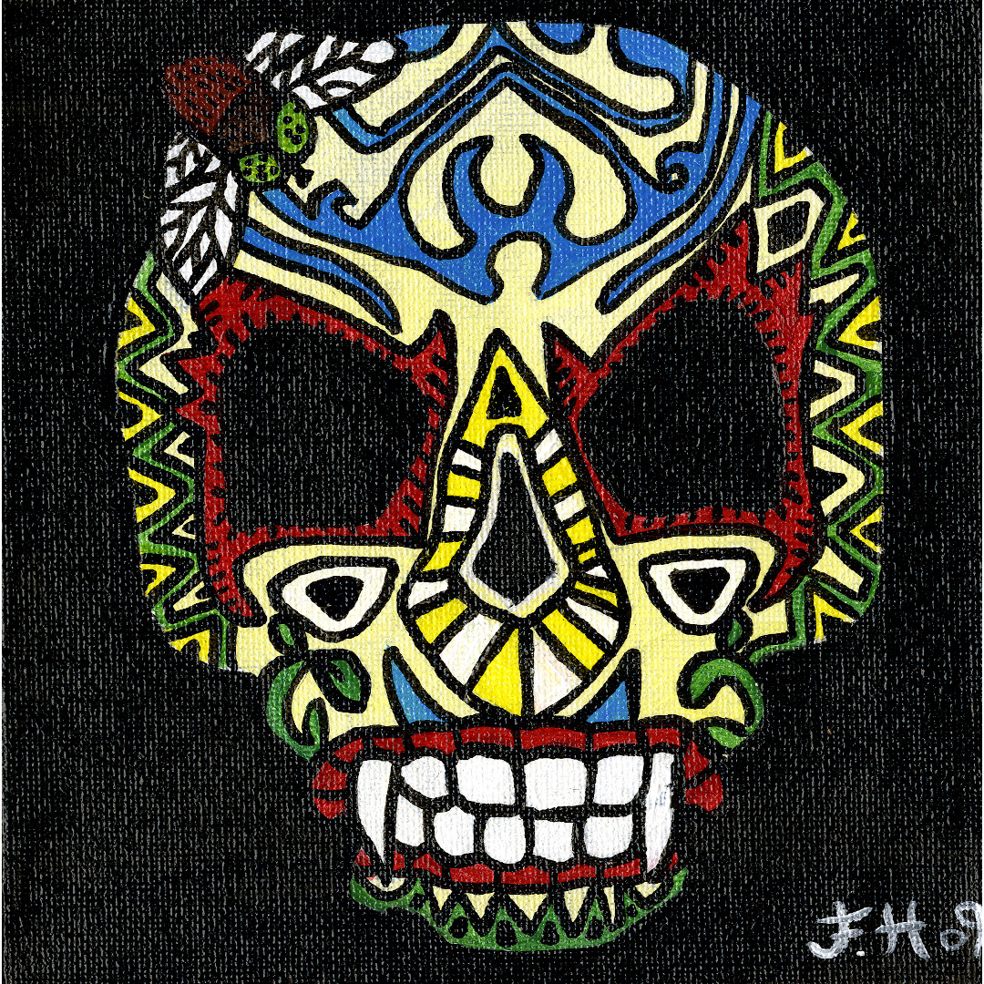 Petite peinture de vanité à la manière de celles du Mexique, pour la fête des morts . Celle ci porte une petite mouche en coiffure .
