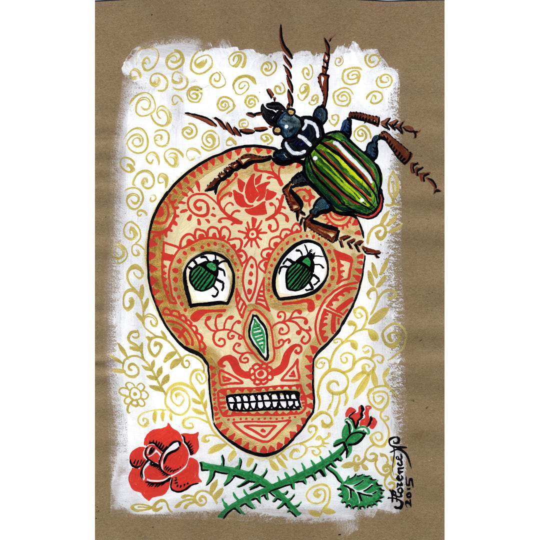 belle peinture à l'acrylique sur papier chiffon de récupération rehaussée aux marqueurs noir et de couleur dorée. On y retrouve certains des thèmes de mes déambulations artistique : la tête de mort, les insectes et le rapport à la Nature.