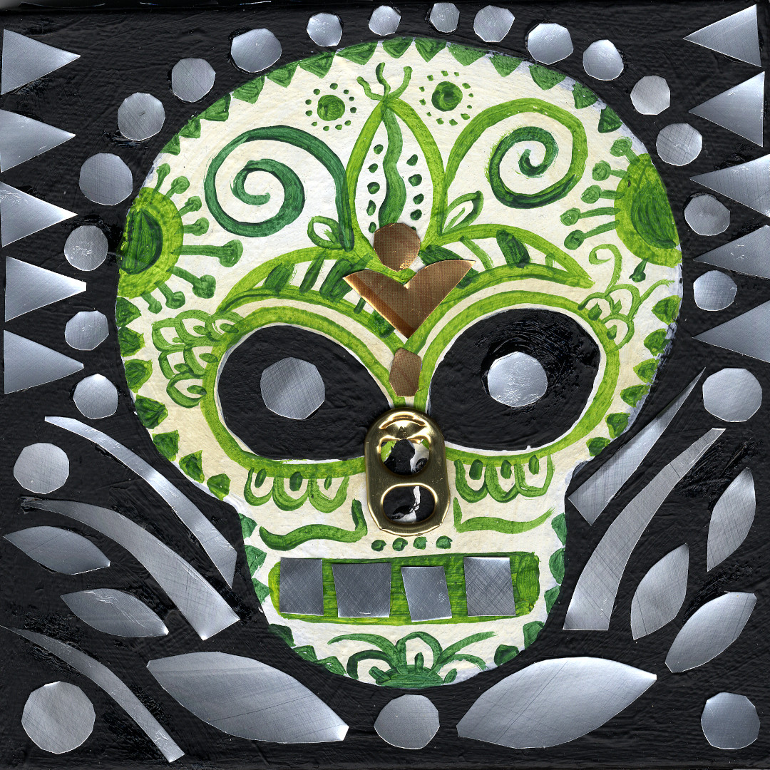 Petit tableau de la collection des vanités, réalisé en technique mixte, associant peinture et morceaux d'aluminium prélevés sur des canettes de boisson .